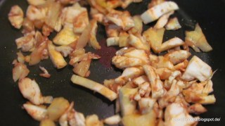 - Издълбаното месо от патладжаните нарязвам на ситно и изпържвам до омекване в 2 с. л. от мазнината.