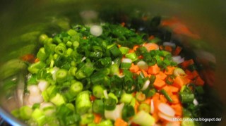 - В тенджерка загрявам 2 с. л. олио и задушавам за кратко ситно нарязания лук и нарязаните на малки кубчета моркови.