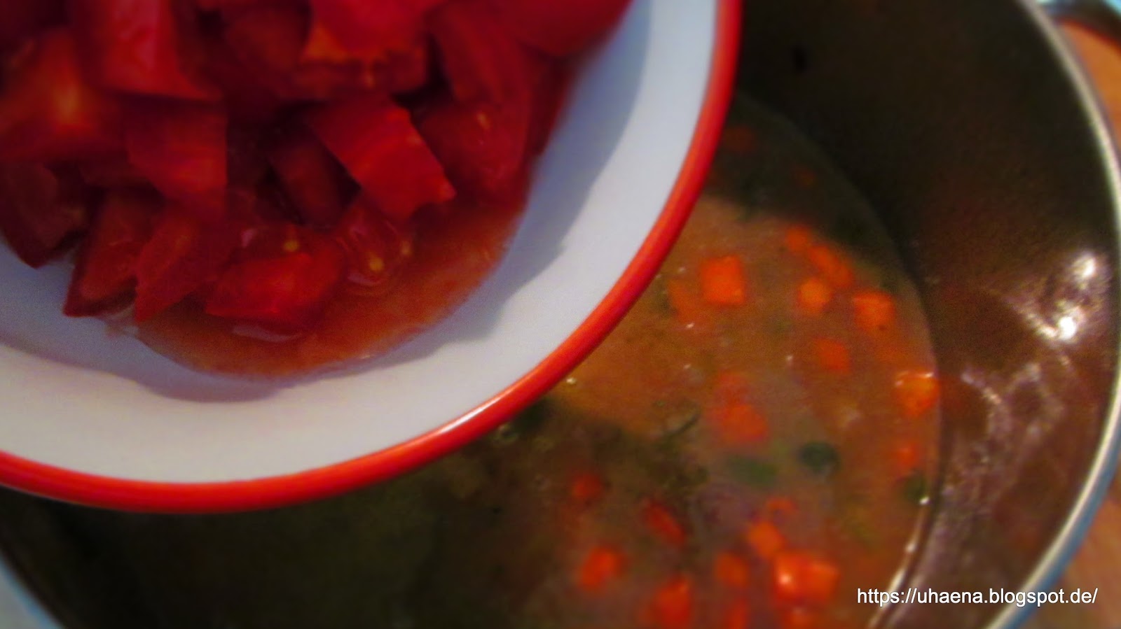 - Намалявам котлона на средна мощност, добавям доматите нарязани на много малки кубчета и оставям ястието да къкри около 20 минути.