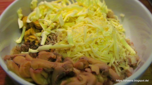 • В купа смесих каймата, сместта от блендера, половинната кашкавал,  маслото /настъргано/, горчицата и много добре изцедените гъби.
