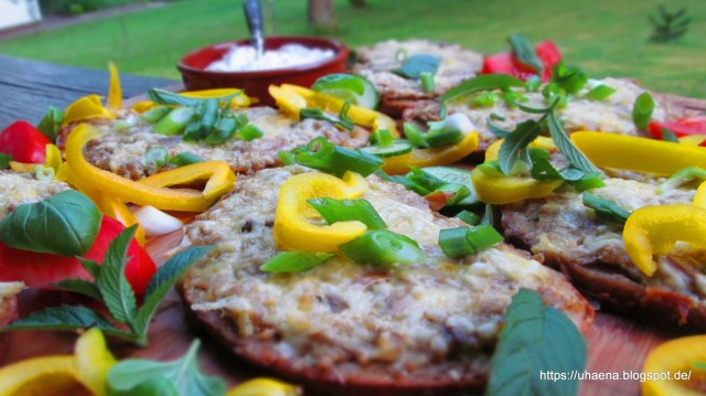 Аз ги сервирах небрежно върху голямата бамбукова дъска и ги оцветих с много лентички от жълта чушка, резенчета домат, листенца босилек и пресен джоджен.