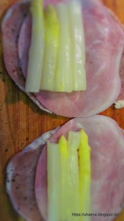 - Отрязах аспержите така, че да се съберат като размер върху шунката. При мен се събраха по три парченца, но това зависи от дебелината на аспержите.