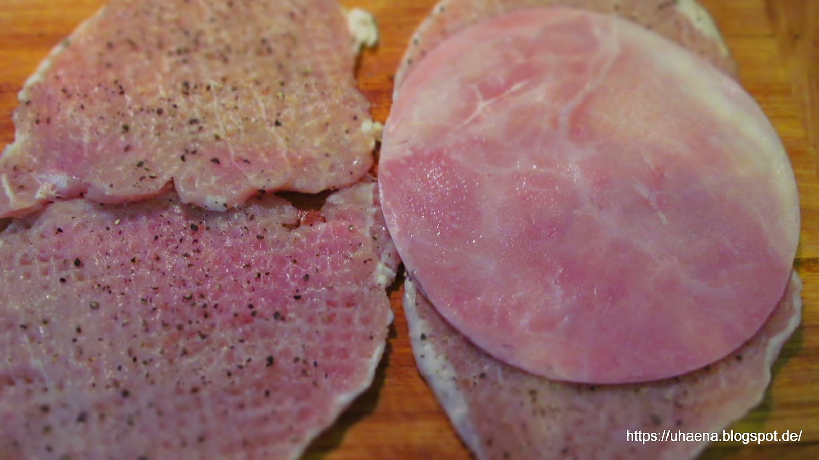 - Съединих две по две каретата и покрих с филийка от шунката, но точно по средата. Там където съм съединила месото с клечки за зъби или специалните игли за руладини е средата на парчето шунка.