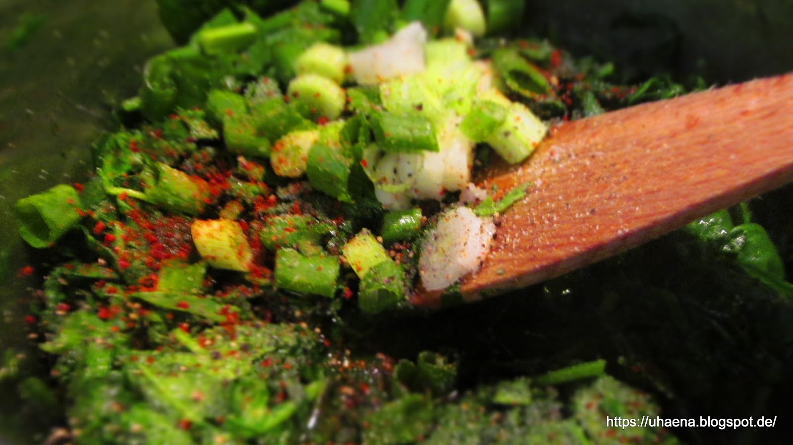 • Задушавам го в олиото като добавям нарязания на колелца зелен лук, джоджена, черния пипер, лютия пипер и сол на вкус. Задушавам докато остане на мазнина.