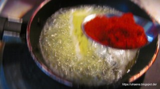 • Малко преди да са готови гюведжетата разтопявам маслото. Отделям от котлона и добавям червения пипер. Разбърквам. Добавям пипера, когато тигана е извън котлона, защото така избягвам препържването му.