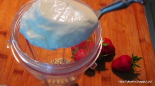 • В блендера за смути сипвам овесените ядки и разбърквам с киселото мляко. Оставям за около 5 минути да престоят.