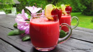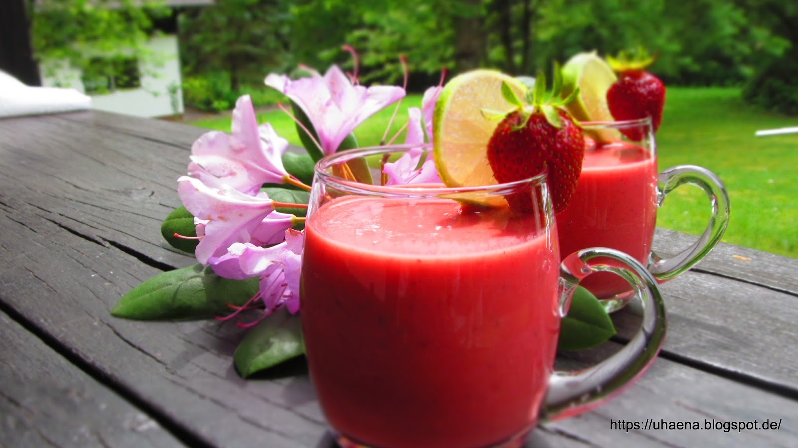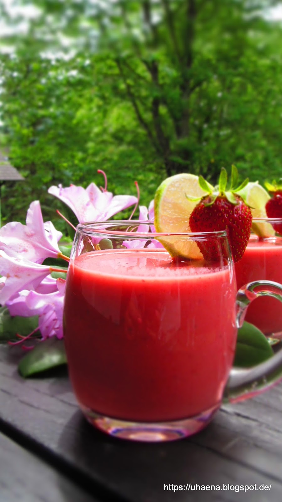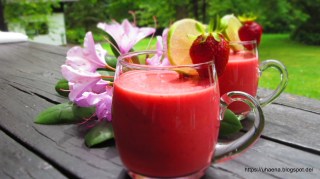 Сервирам смутито веднага и декорирано с ягода и резенче зелено лимонче!