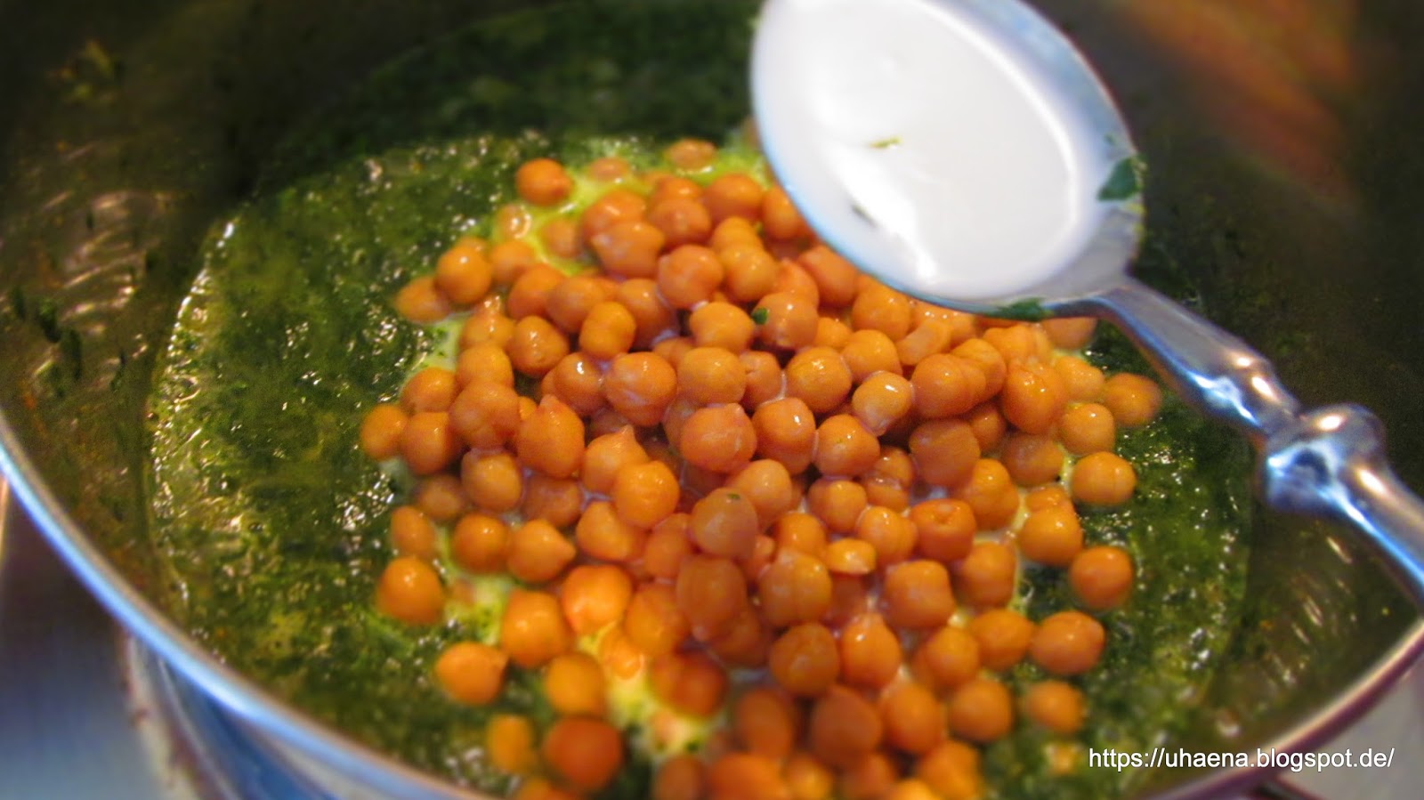 - Нахута изцеждам от течността, изплаквам със студена вода и добре изцеден добавям към почти готовия вече спанак.