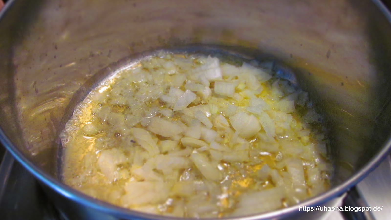 - Лука нарязвам на малки кубчета и задушавам за кратко в 2 с. л. масло.