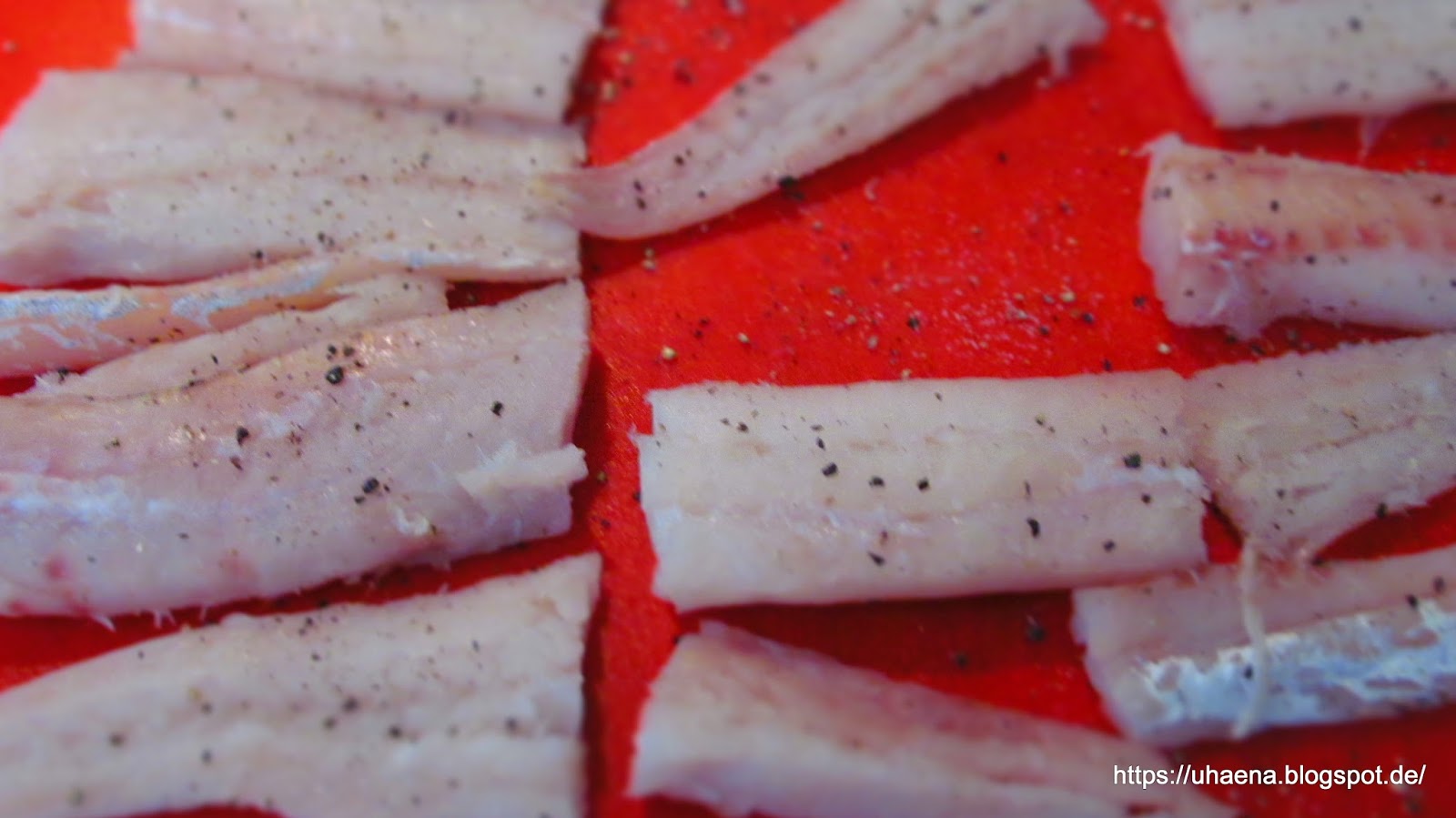 - Измивам рибните филета, подсушавам ги с домакинска хартия и овкусявам със сол и черен пипер.