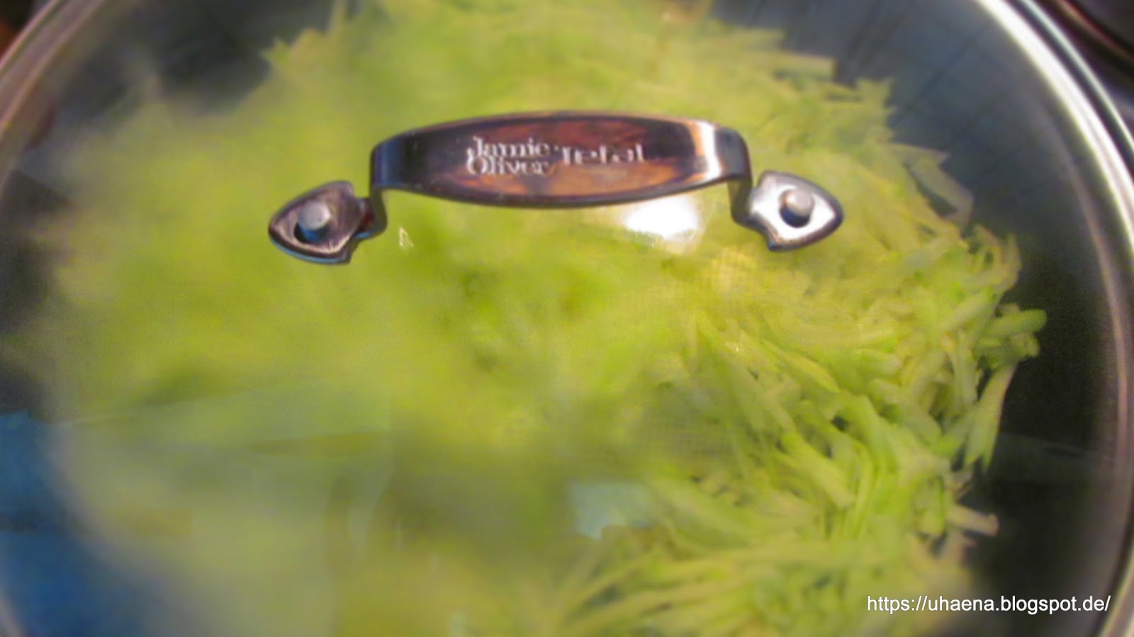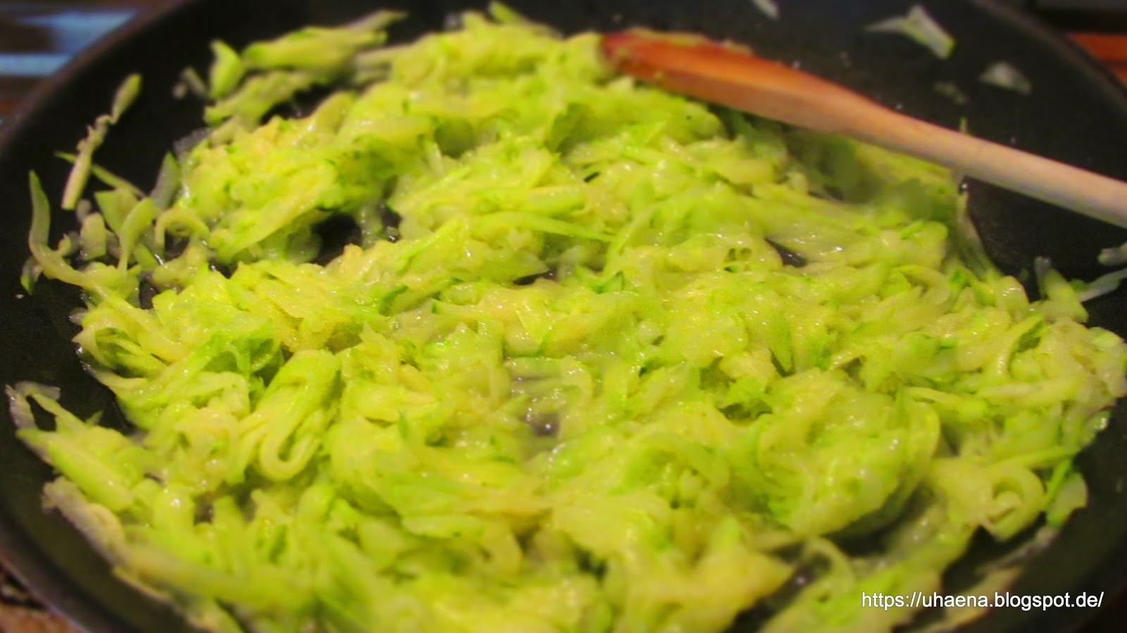 - Загрявам мазнината в тиган и задушавам тиквичките под капак до омекването им.