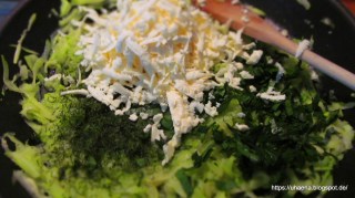 - Добавям към тях нарязаните копър, магданоз и настърганото сирене.
