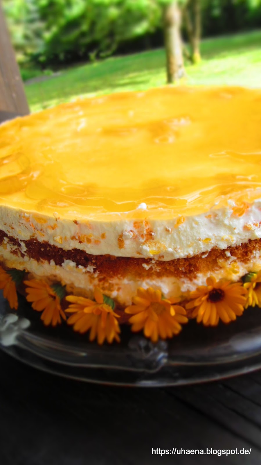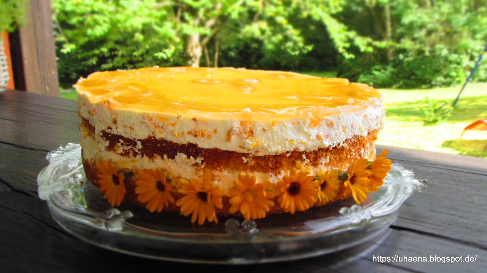 Тази сочна и красива торта декорирах с цвят от невен. От моя свекър знам, че невена е ядлив и е подходящ за хора с диабет. Той си похапваше всеки ден по едно цветче за регулиране на кръвната захар. Е, аз само го използвам за декорация.