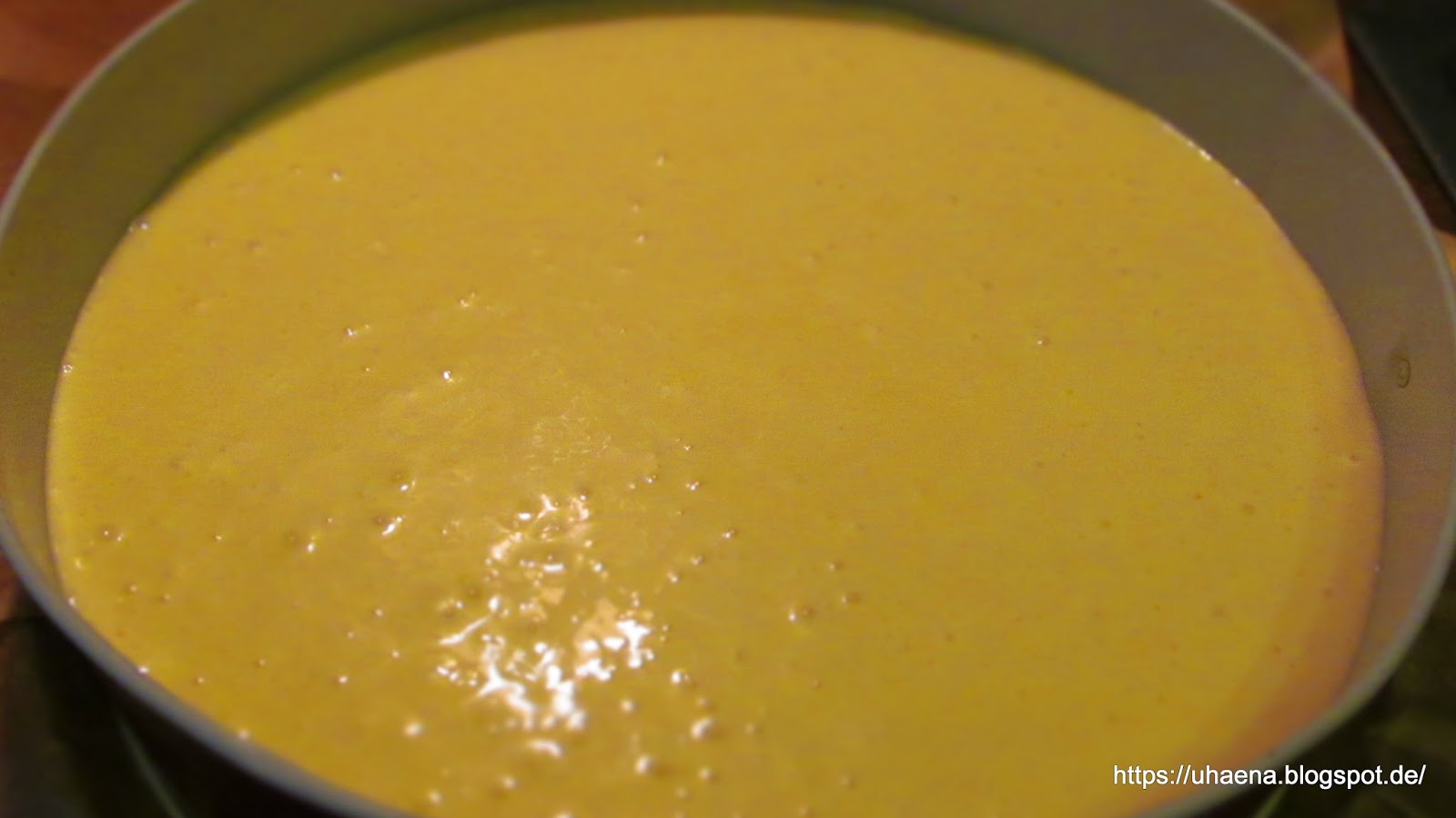 - Изсипвам тестото във форма за торта с диаметър 28 см, която предварително съм намазала с олио и дъното съм покрила с хартия за печене.