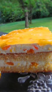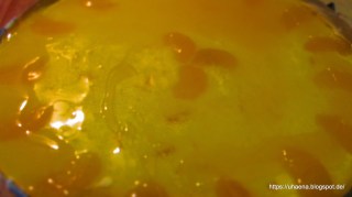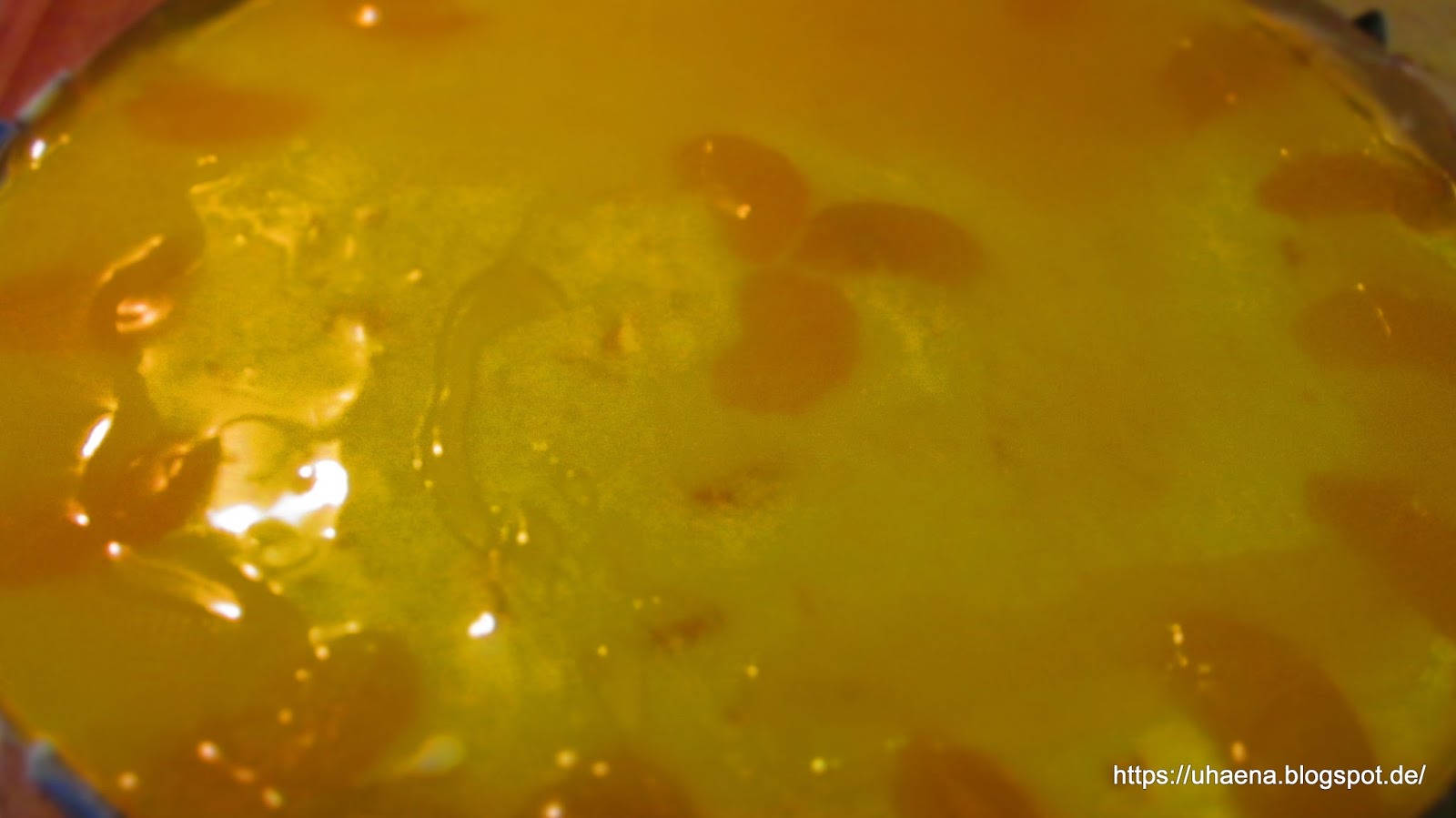 - Когато тортата е достатъчно стегнала, приготвям капачето от сок в жълт цвят. Ако нямате пакетче Tortenguss, можете да използвате нишесте или отново желатин. Това е въпрос на Ваше предпочитание.