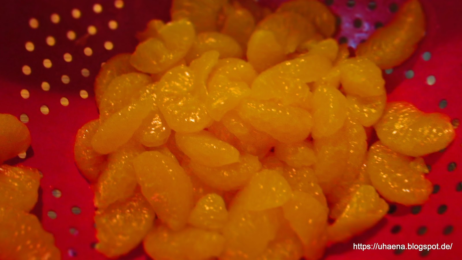- Изсипвам мандарините в купата със заквасена сметана като предварително съм отделила 20 бройки за декорация на тортата.