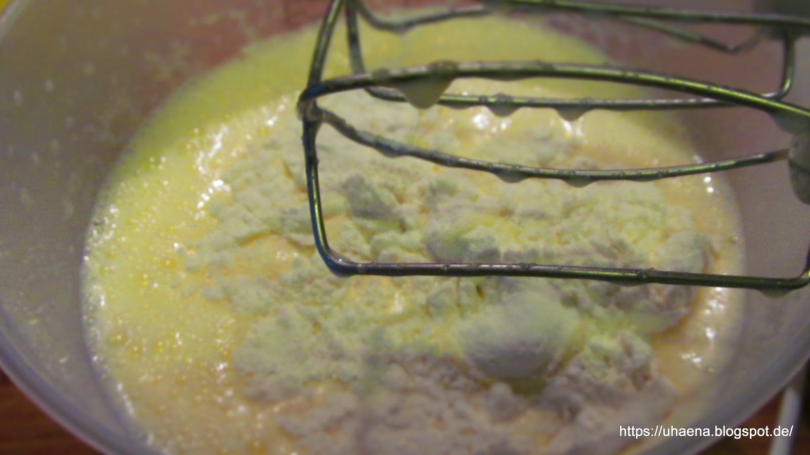 - Към яйчената смес добавям на два три пъти предварително смесените брашно и бакпулвер.
