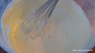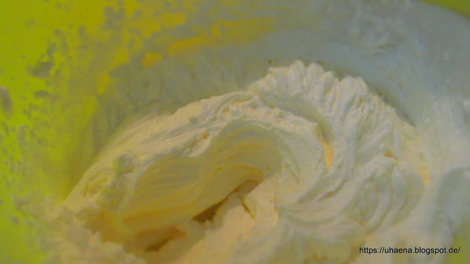 - В друга купа течната сметана разбивам с миксер, заедно със захарта и втвърдителя за сметана.
