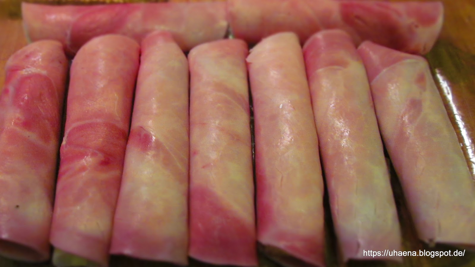 - Всяко парче праз увивам в тънка филия от пражката шунка.
