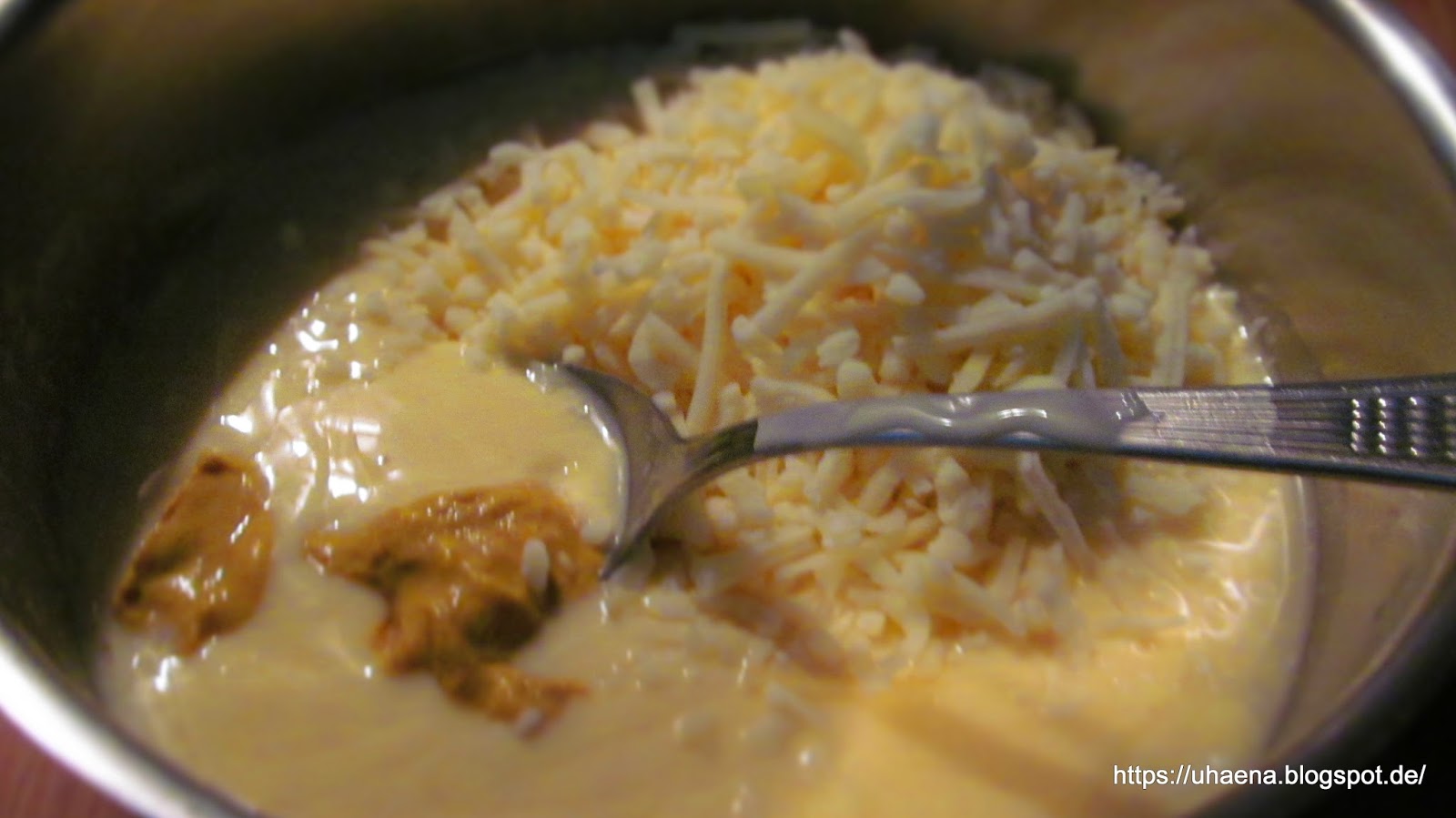 - В купа изсипвам готовия холандски сос и доовкусявам с горчицата. Добавям и настъргания кашкавал. Разбърквам.