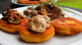 Тези картофени питки се поднасят като основа на месо, пържени и печени на скара хапки от месо и др. Върху питките могат да се сложат пържени гъби.