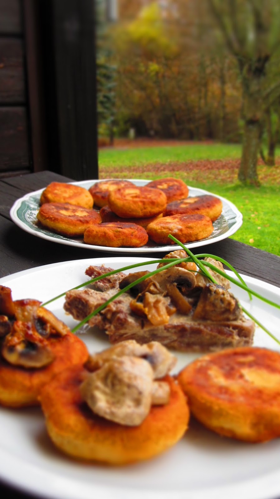 Тези картофени питки се поднасят като основа на месо, пържени и печени на скара хапки от месо и др. Върху питките могат да се сложат пържени гъби.