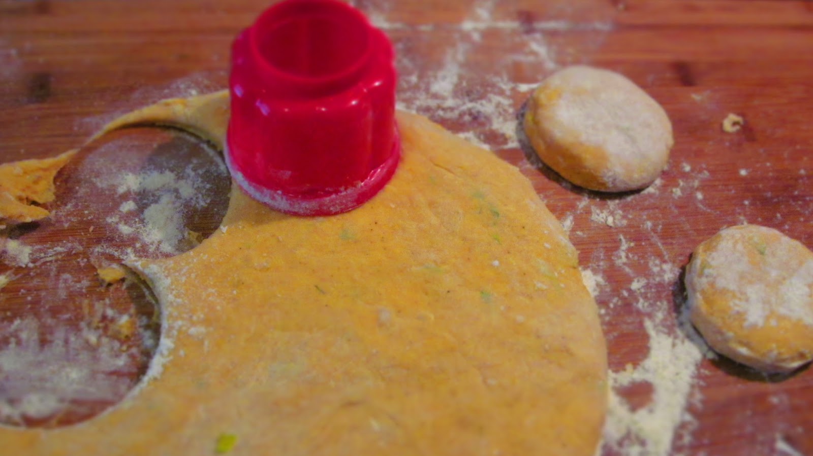 - От тестото разточвам кора с дебелина около 2 см. и с помощта на чашка изрязвам кръгове.