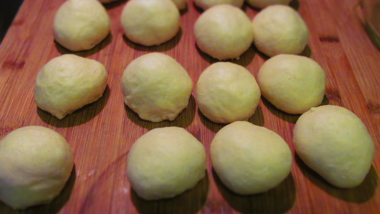 - Премесвам втасалото тесто с намазани с олио ръце и разделям на 16 еднакви топки.