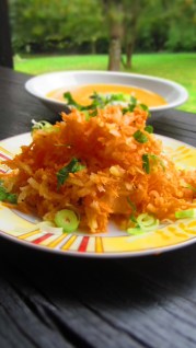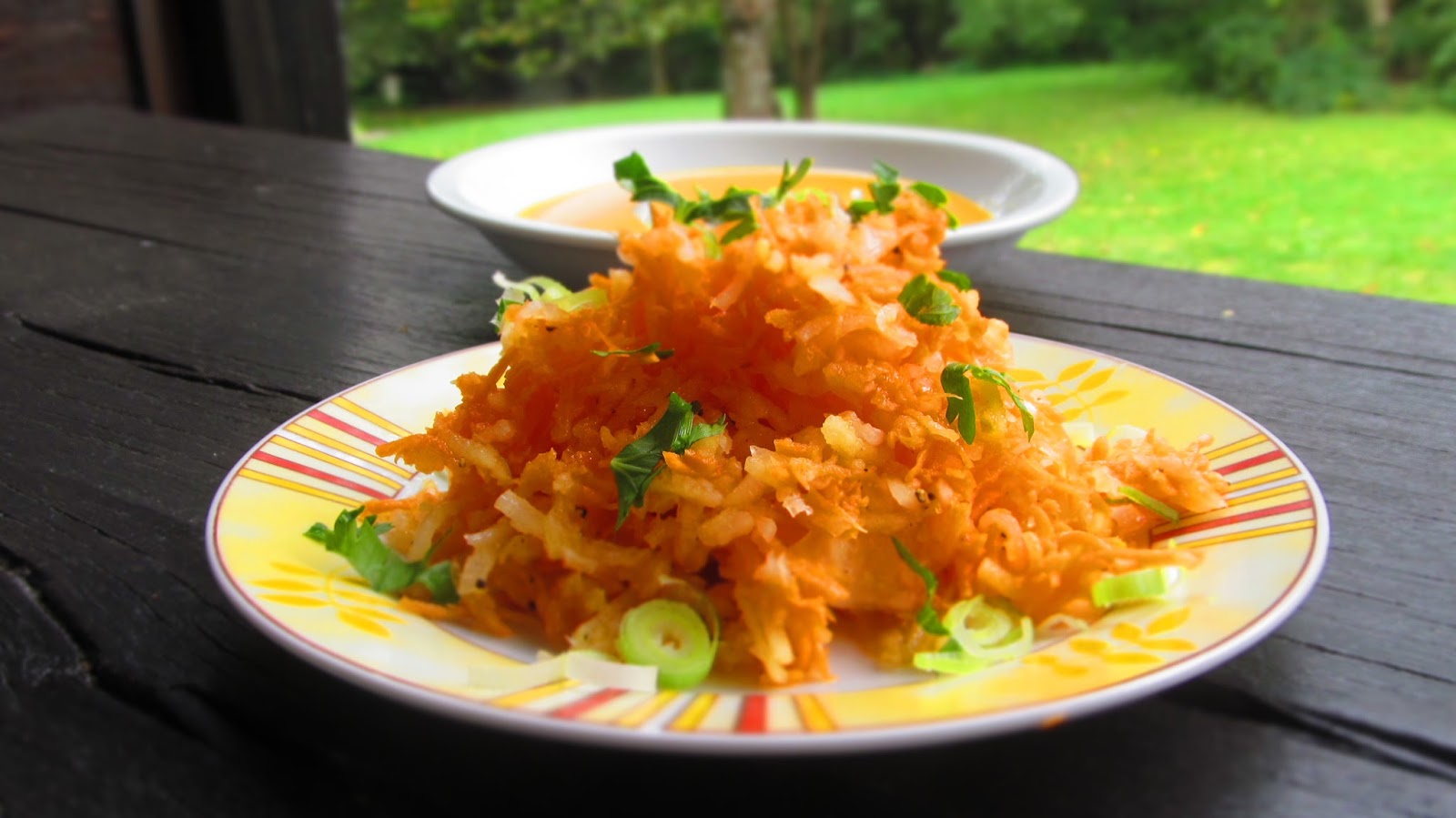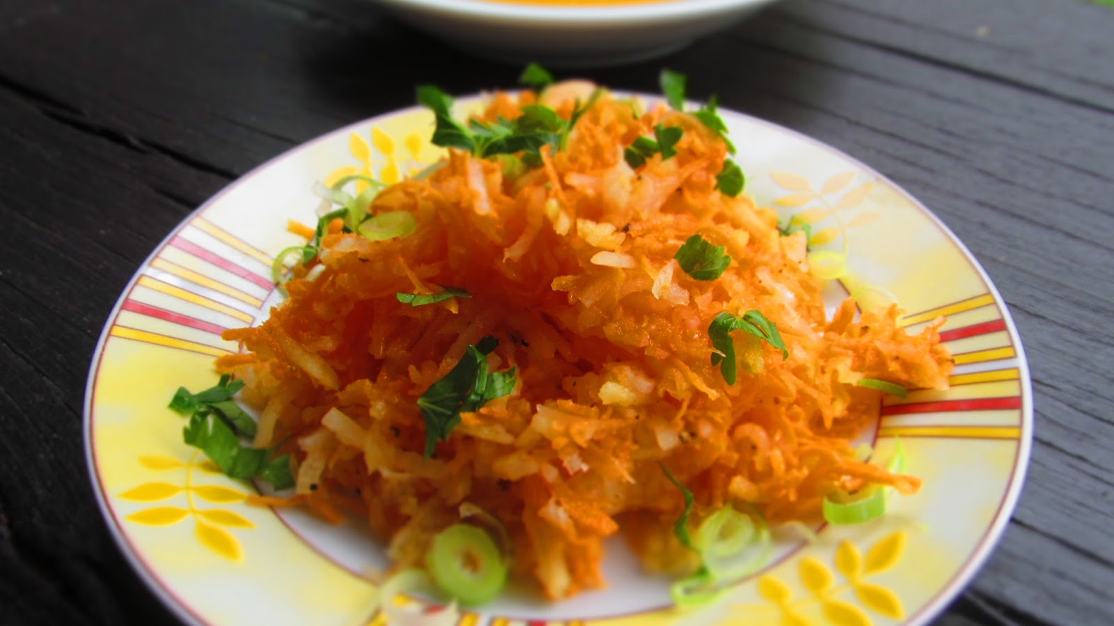 Разликата в днешната салата е, че е приготвена от Retich – немската бяла ряпа. Тя не е толкова силно люта и с не така изразен мирис, както познатата ни от детството бяла ряпа. Но пък се получава много вкусна салата с моркови и добавена от мен – ябълка.