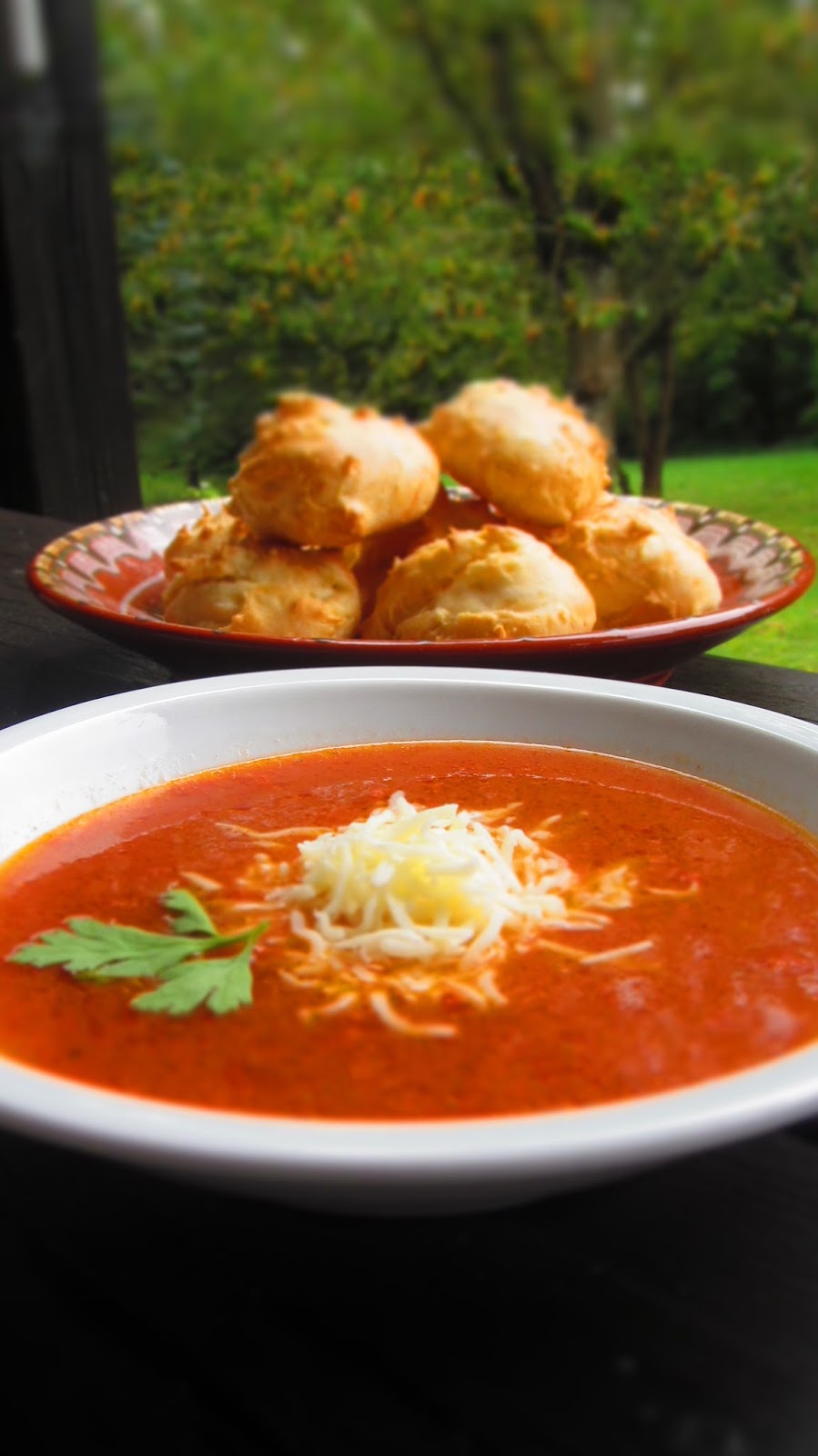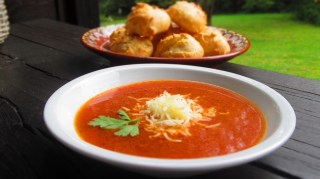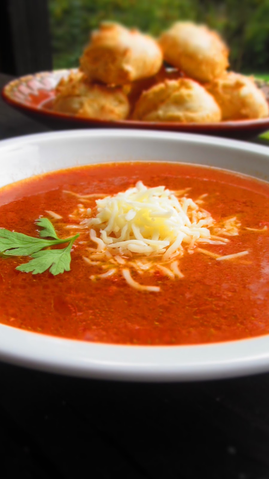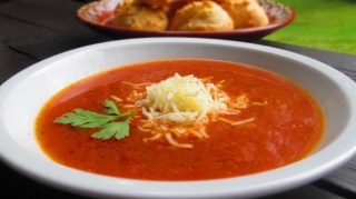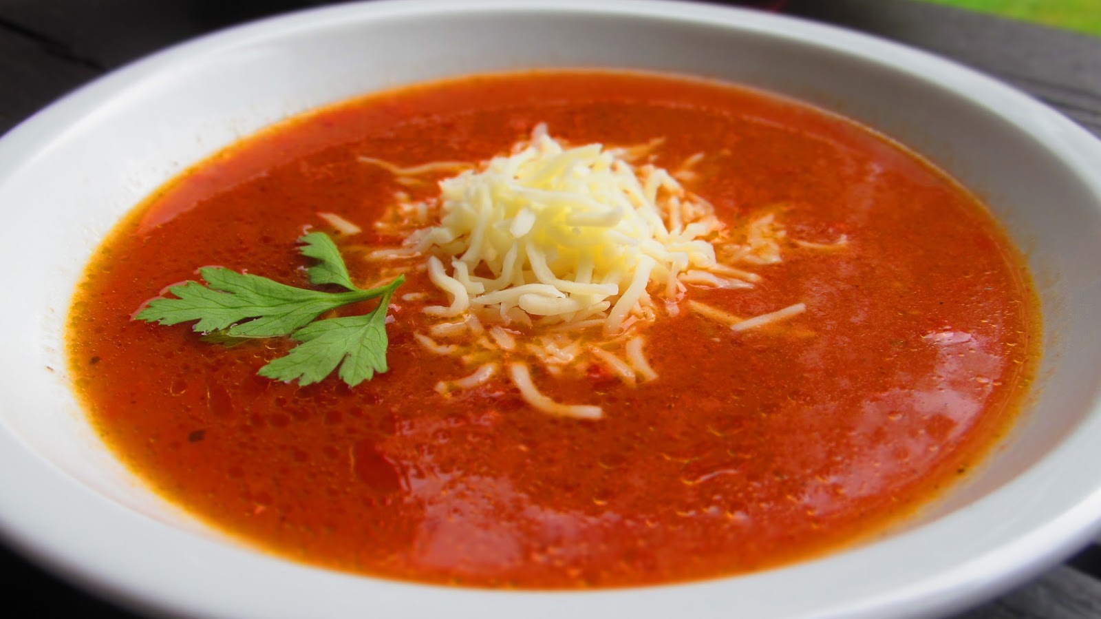 Сервирам доматената супа гореща с добавеното настъргано сирене.