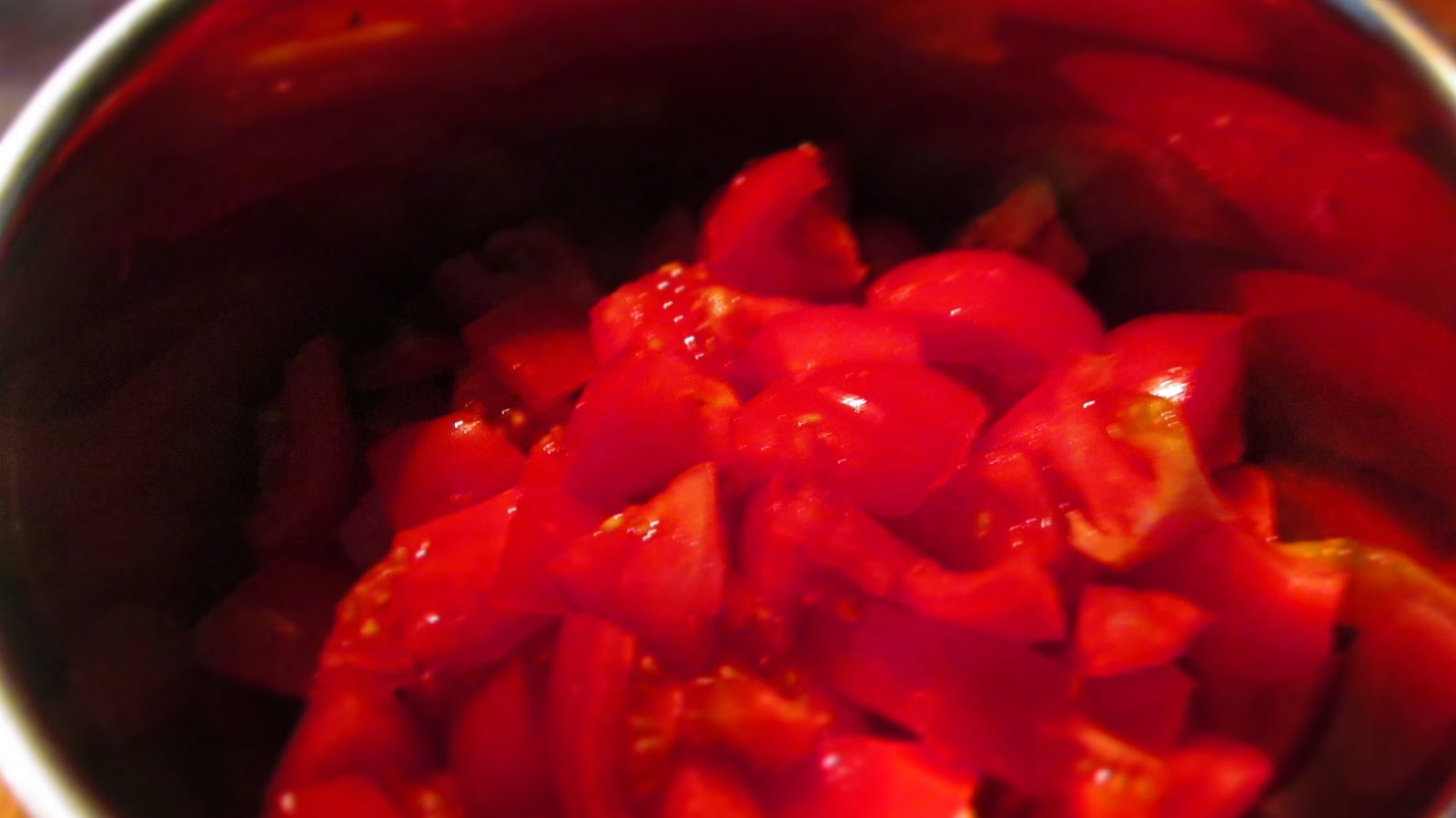 - Измивам доматите и ги нарязвам на едри кубчета.
