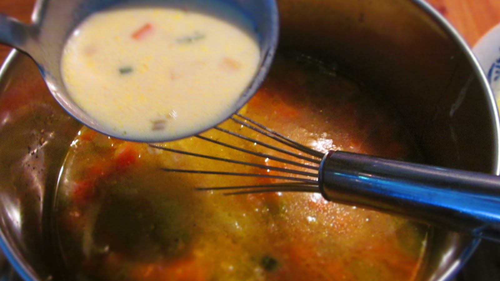 - Затоплената застройка добавям на тънка струйка и постоянно разбъркване към супата.
