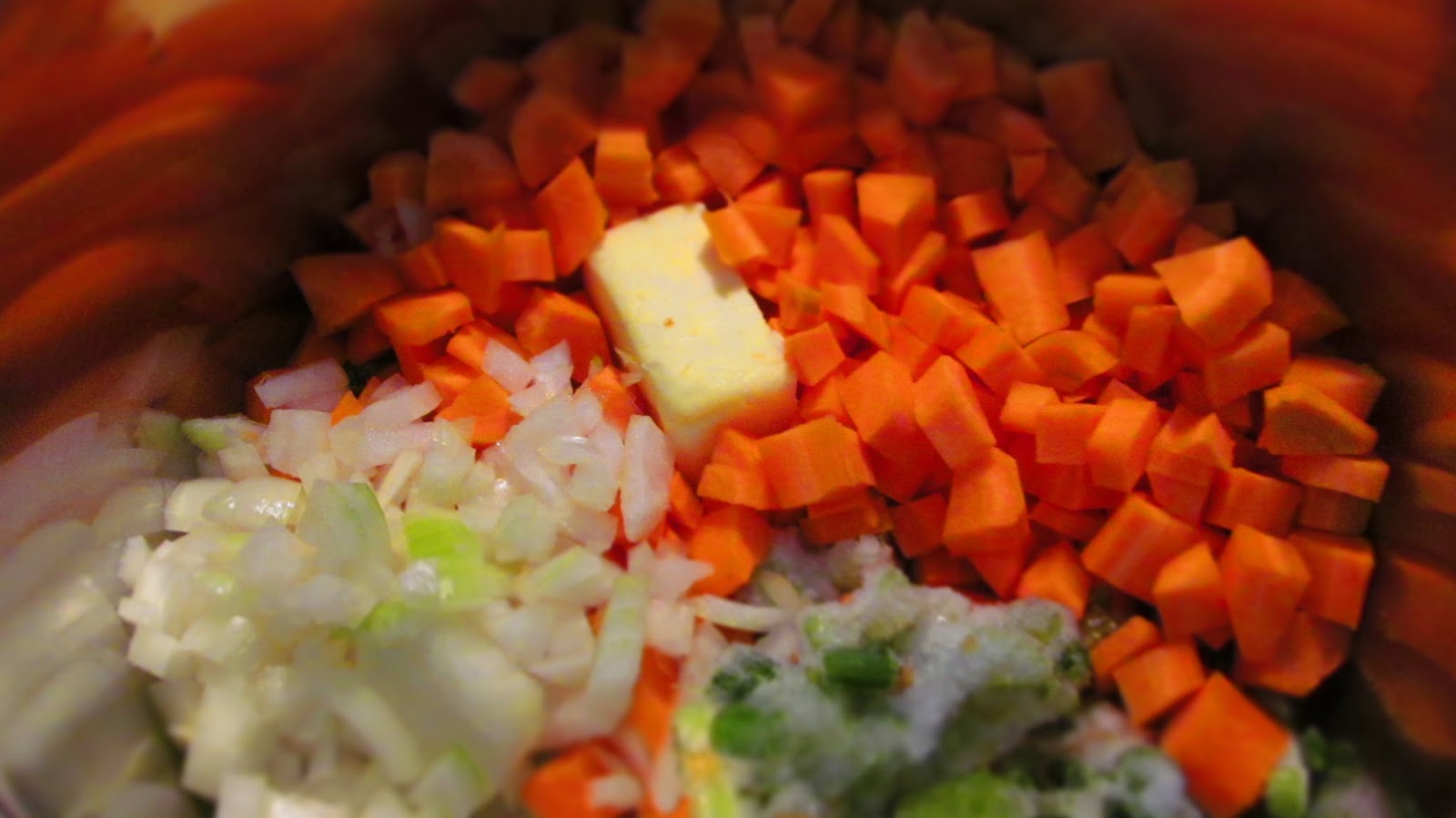 - Изчиствам, обелвам и нарязвам на кубчета морковите, целината /аз използвах моето замразено селери/ и лукът.