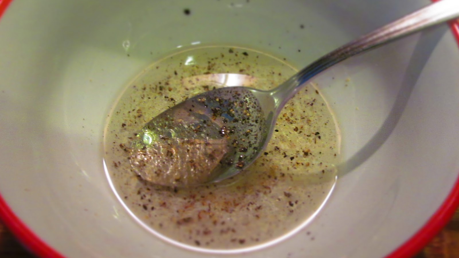 • Смесвам зехтина /може да замените с мазнина по Ваш избор/, белия балсамов оцет, малко сол и черния пипер. Разбърквам и заливам салатата.