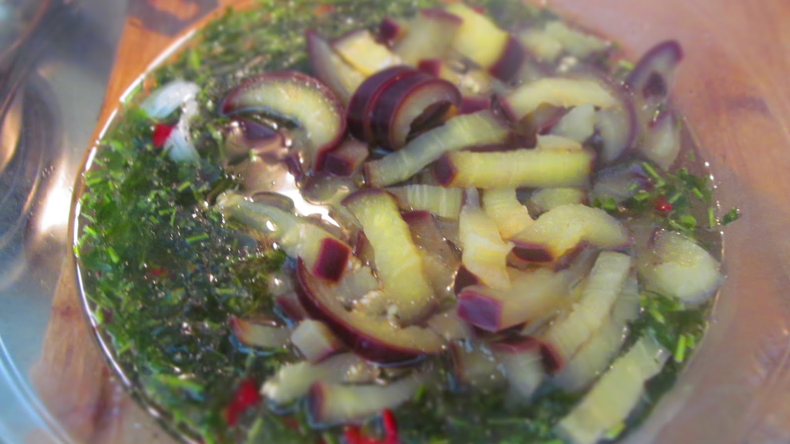 Една вечер случайно попаднах на предаване на Джейми Оливър, където той приготвяше туршия от патладжани. Беше доста късно и не ми се пишеше. Реших, че ще открия после рецептата в интернет. На другия ден реших двете патладжанчета, които имах да приготвя по неговия начин и потърсих рецептата, но не я открих. Тогава започнах да възстановявам спомените от предаването и се получиха тези невероятни кисели патладжани!