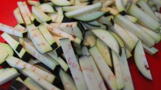 - Когато водата заври пускам нарязаните на лентички патладжани. Моите лентички са около 1 см широки и 4 – 5 см дълги.