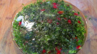 - В купа смесвам мазнината, лютите чушки, ситно нарязания магданоз, сол, черен пипер и захар.