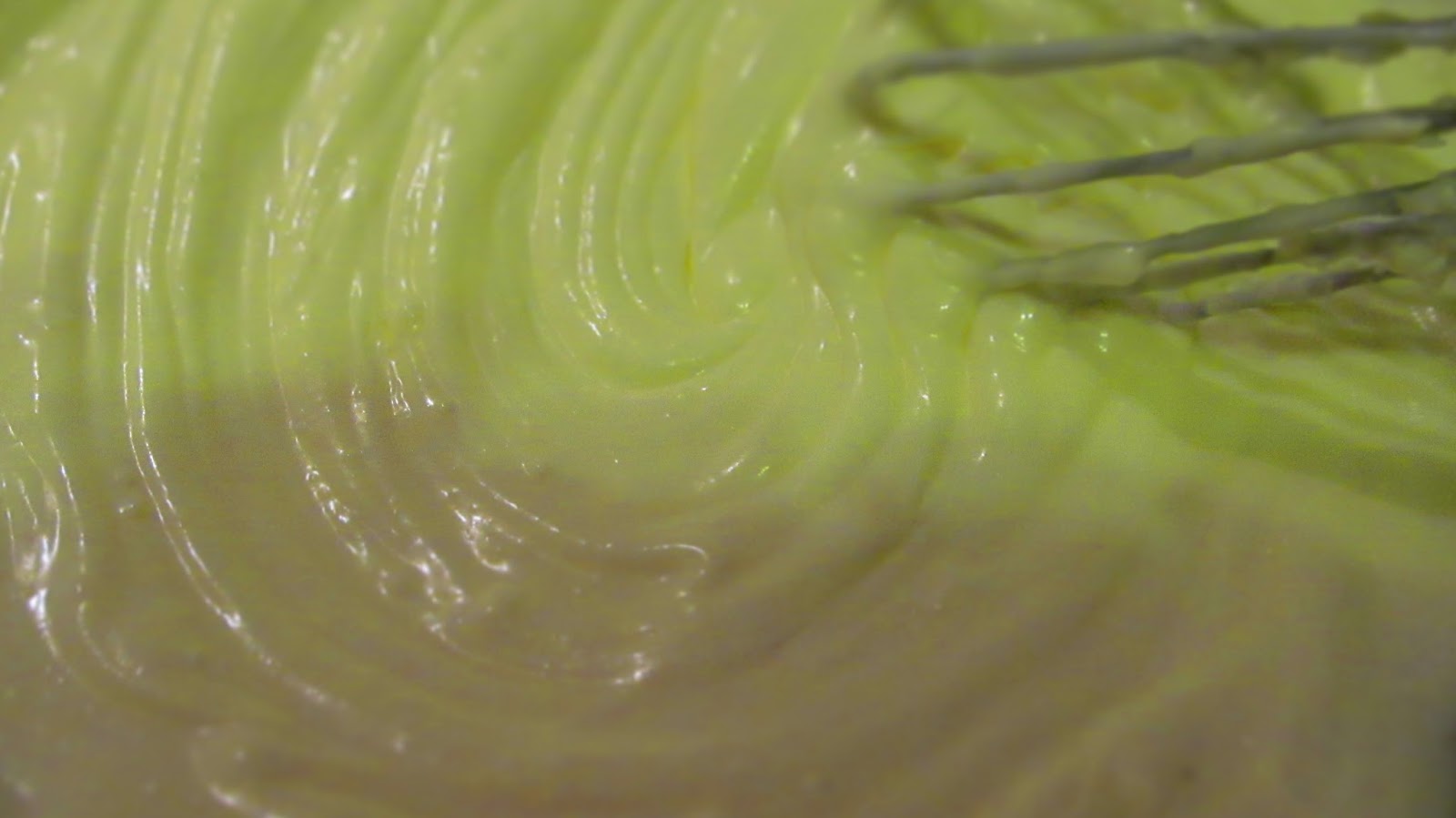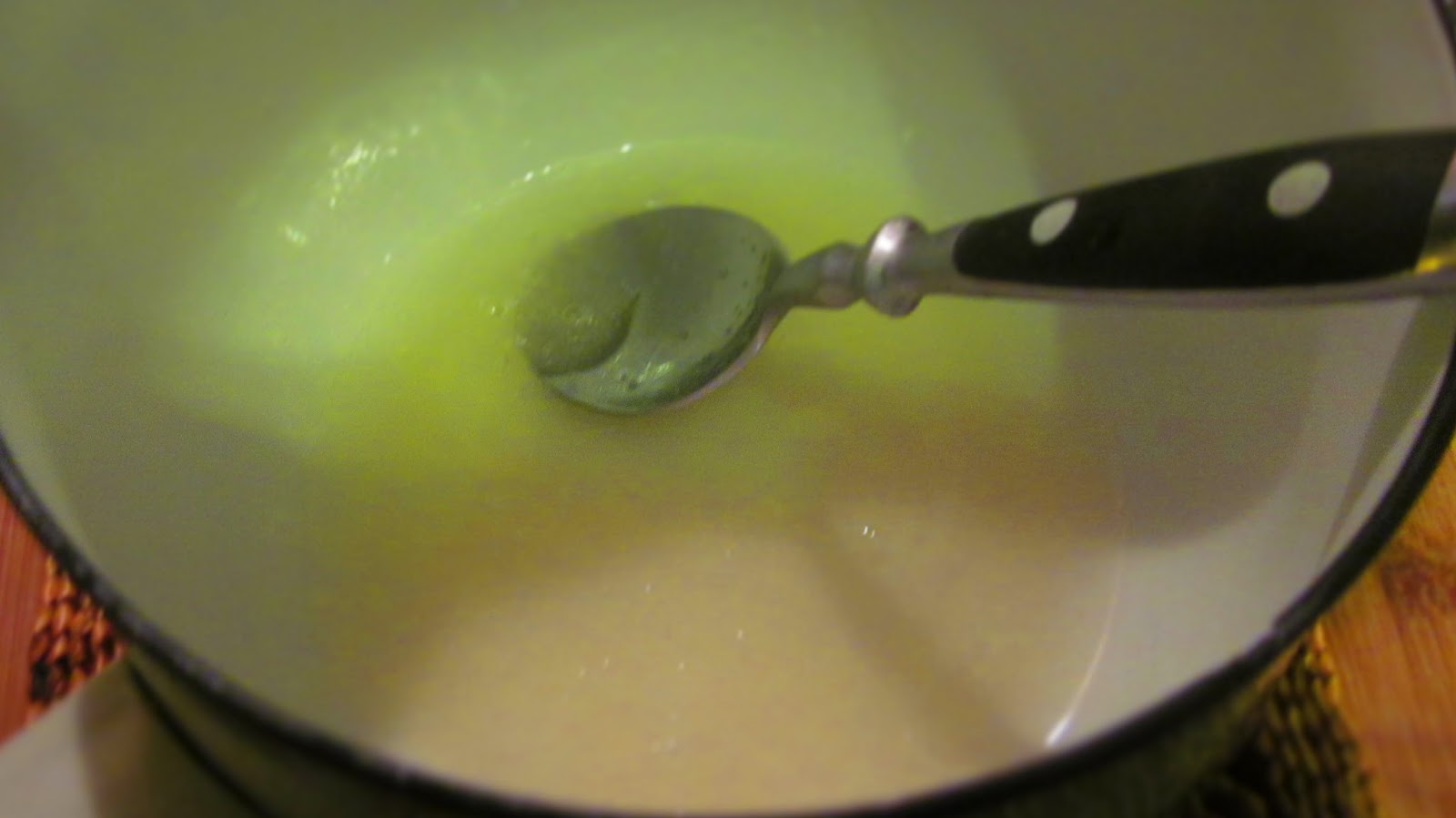 • 2 – 3 супени лъжици от изварената смес добавям към разтопения желатин и разбърквам. Това се прави  с цел уравновесяване температурата на желатина и изварата.