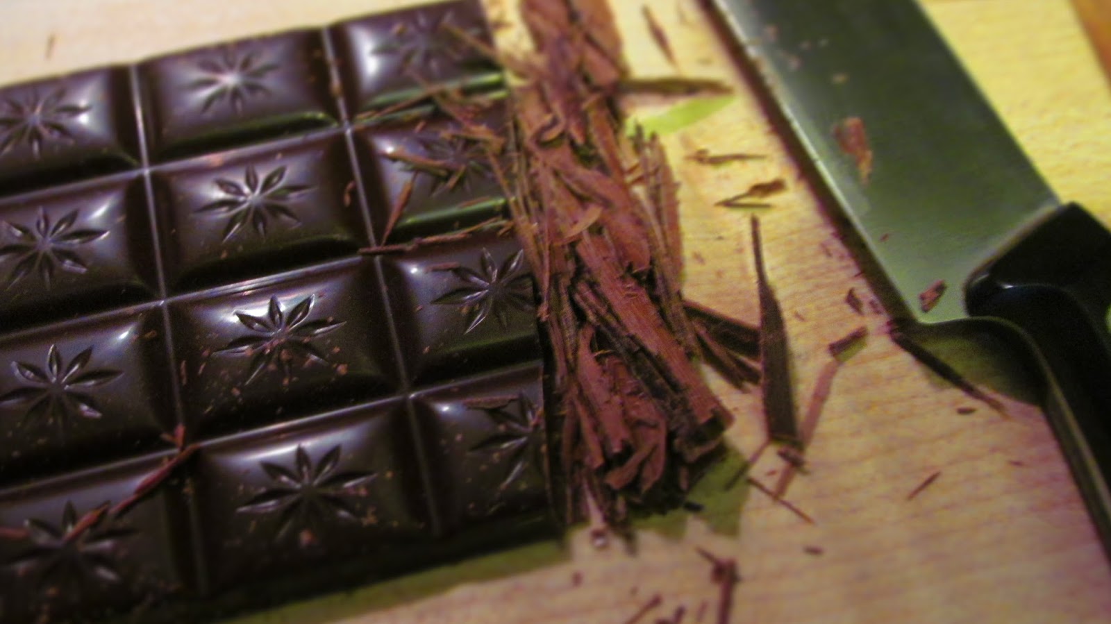 • Последното количество шоколад настъргвам на шоколадови пръчици с помощта на остър нож.