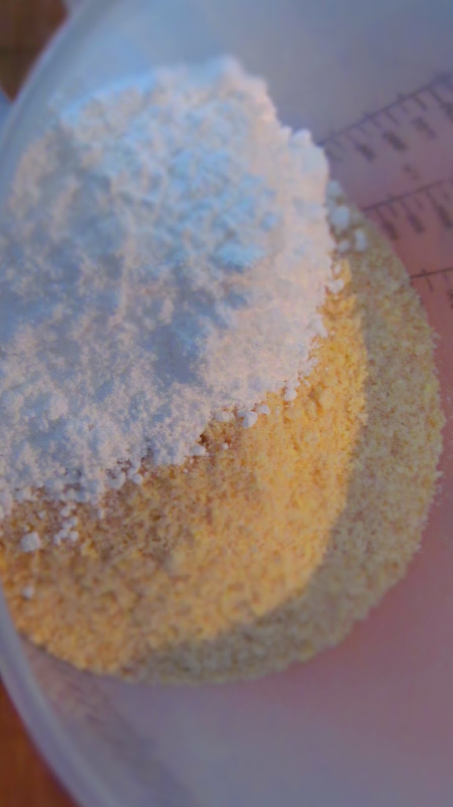 - В купа смесвам белените и смлени бадеми заедно с пудрата захар.