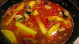- След като съм пържила малко картофите, изсипвам консервата домати върху тях. Ако използвате пресни домати – нарежете ги на кубчета.