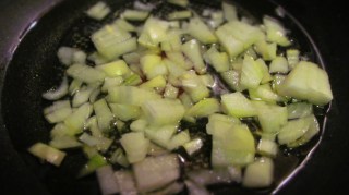 - В тиган уок /защото е дълбок/ задушавам в олиото и малко вода нарязания на едри кубчета лук.