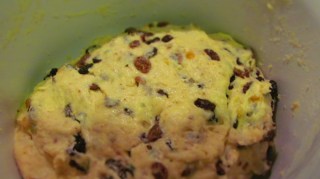 - Добавям сушените плодове и захаросаните корички от лимон и портокал. Разбърквам с миксера много добре.