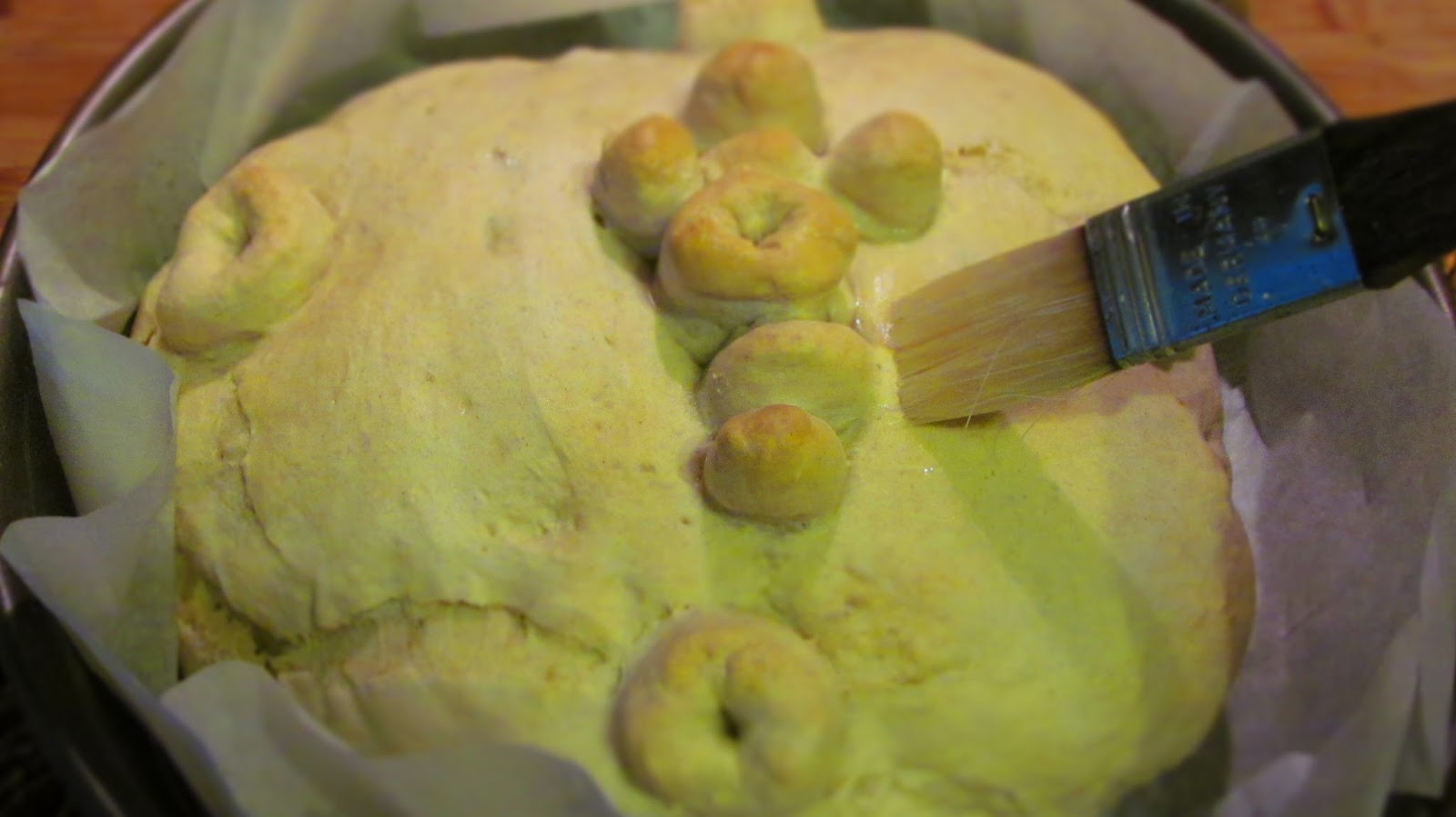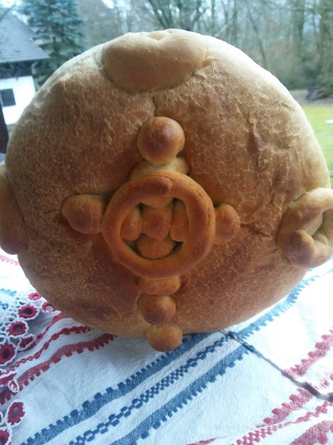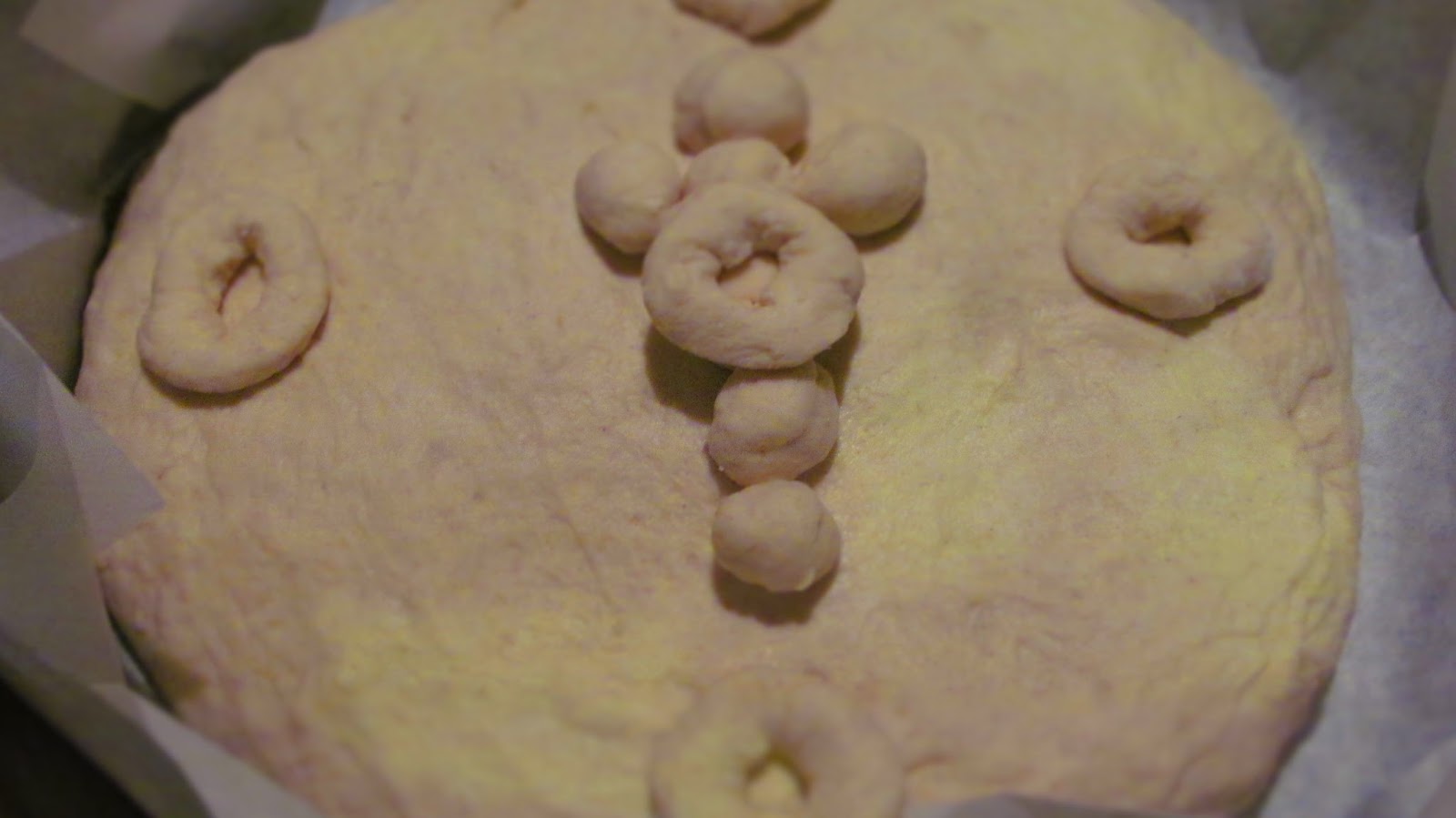 • От отделеното тесто оформям кръст и няколко кръга. Четири кръга подреждам в четирите края на питката. Те символизират годишните времена. В средата оформям кръст, а върху него още един кръг – олицетворяващ Земята.
