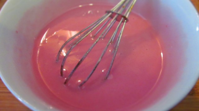 - С тази розова захарна глазура заливам намазания предварително с черешово желе отделен блат.