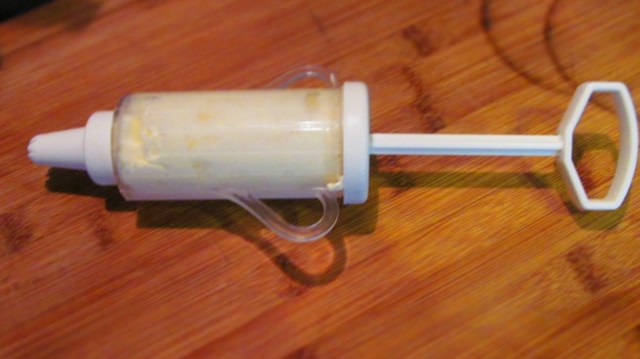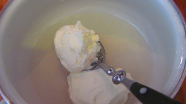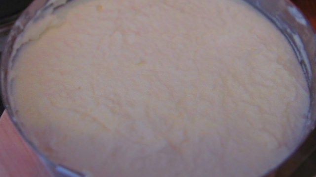 - Към леко охладения и течен желатин добавям 2 – 3 с. л. от сметаната, за да се изравнят температурите.