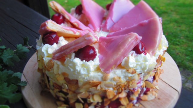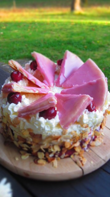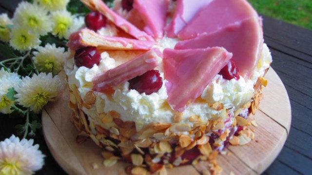 - Върху охладената торта шприцовам толкова розички, колкото парчета ще има тортата /12/ и върху тях слагам отделените от компота черешки.