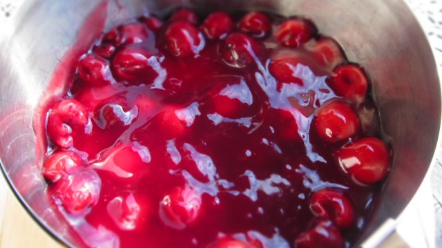 - Когато гъстотата на черешовия сос ме удовлетворява, добавям и черешите.