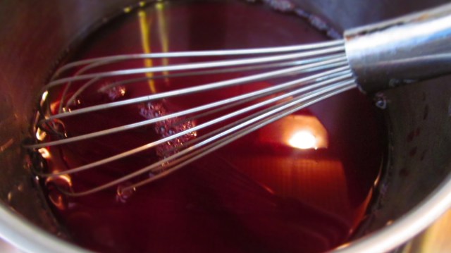 - С постоянно разбъркваме на сока добавям към него на тънка струйка разтвореното нишесте. Изключвам котлона и оставям сока за около 1 минута да ври, но не спирам да бъркам.