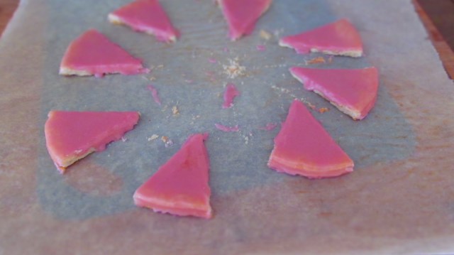 - Стегнатия розов блат нарязвам с остър нож на триъгълници, според това колко парчета искам да има тортата.